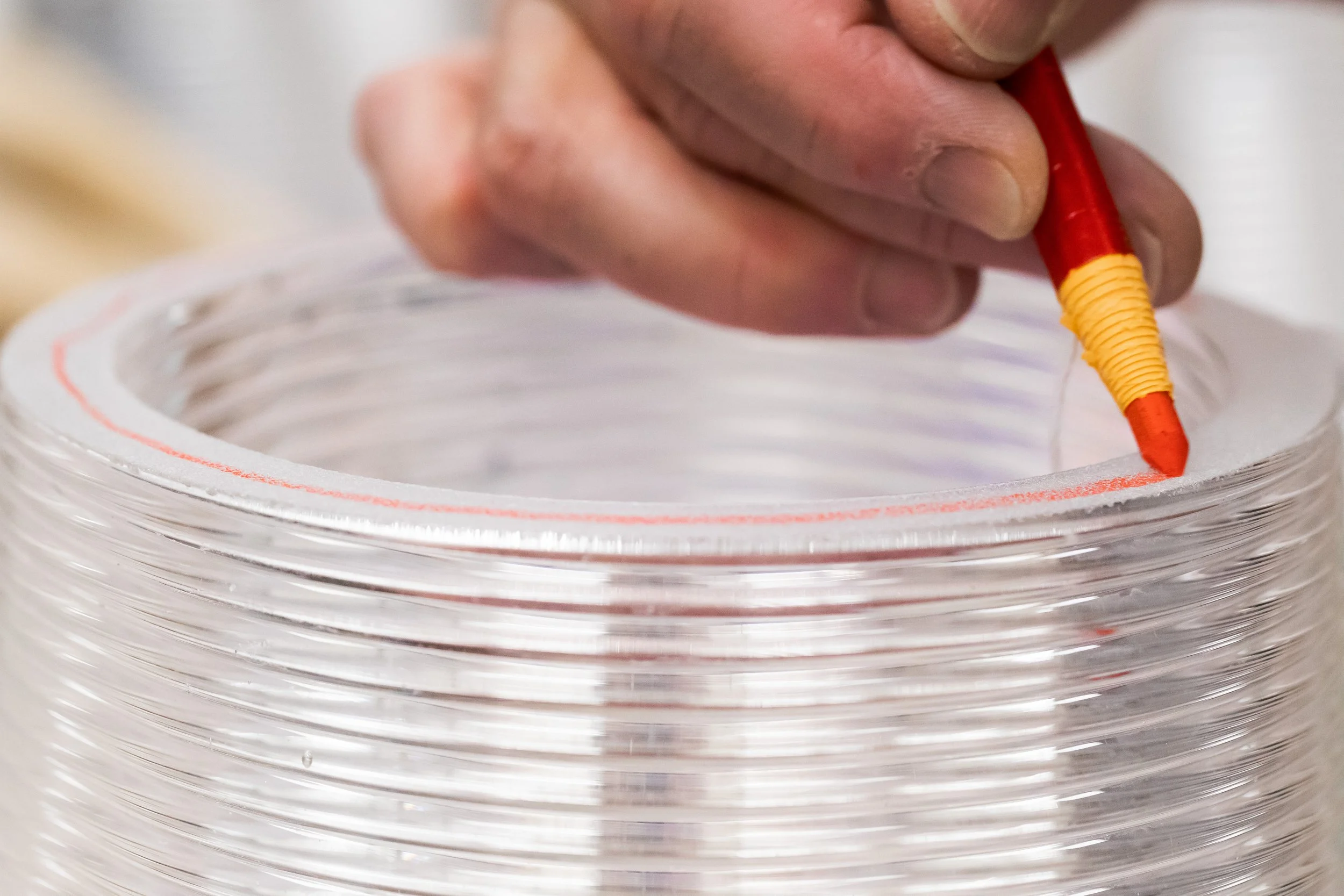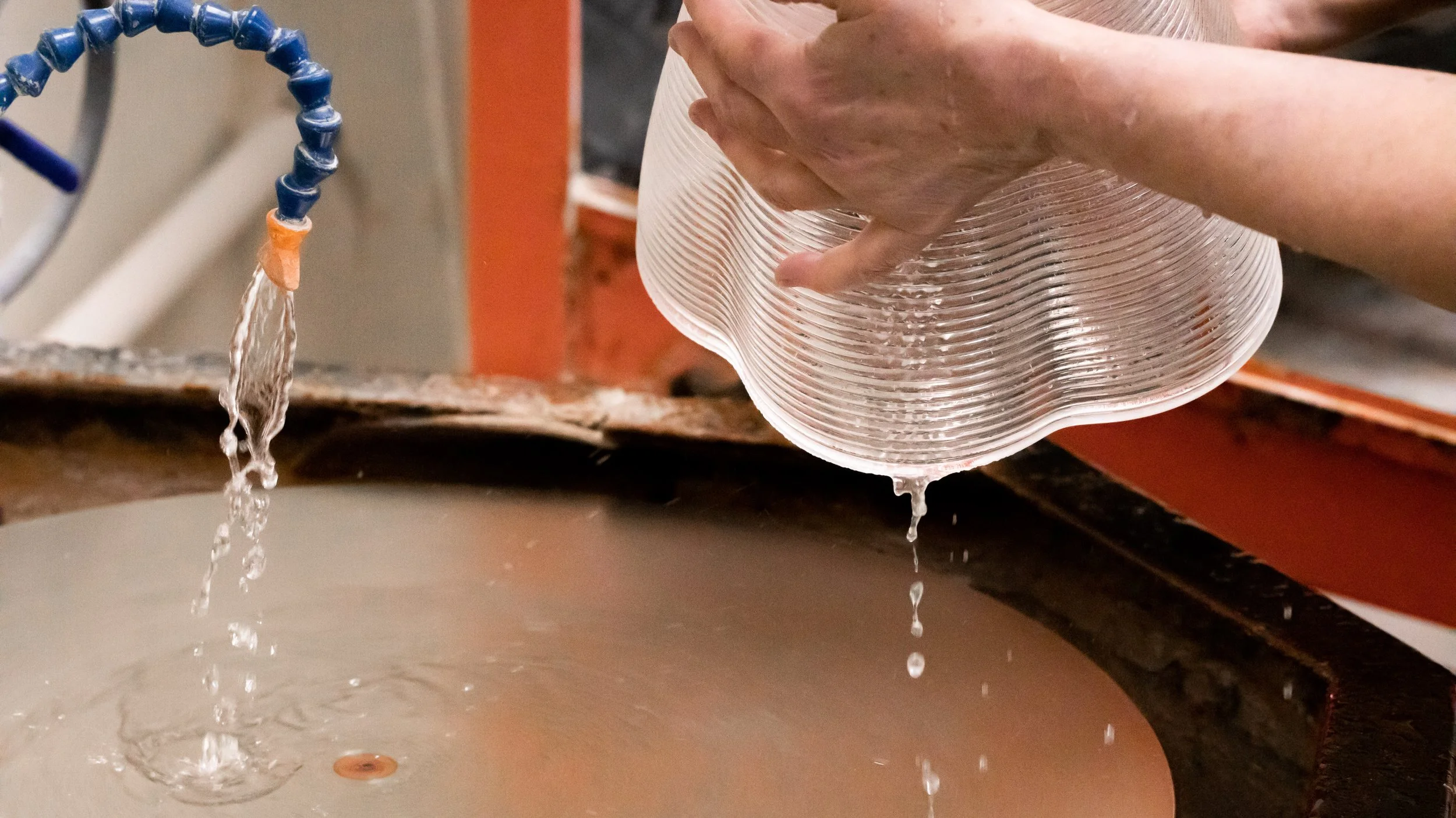Molten glass at 2000ºF drains from an overhead furnace into a 900ºF build chamber, and the designs are built layer by layer as the ceramic printbed receives a continuous filament of material. Printed objects are annealed in a separate chamber over a matter of hours in order to relieve internal stress. Finally, traditional glass cold working tools are used to grind and polish the faces. To match the complex and unique design space for 3D printed glass, custom fixtures are designed for each individual object using the same computational tools as the glass and integrated into our projects and collection.