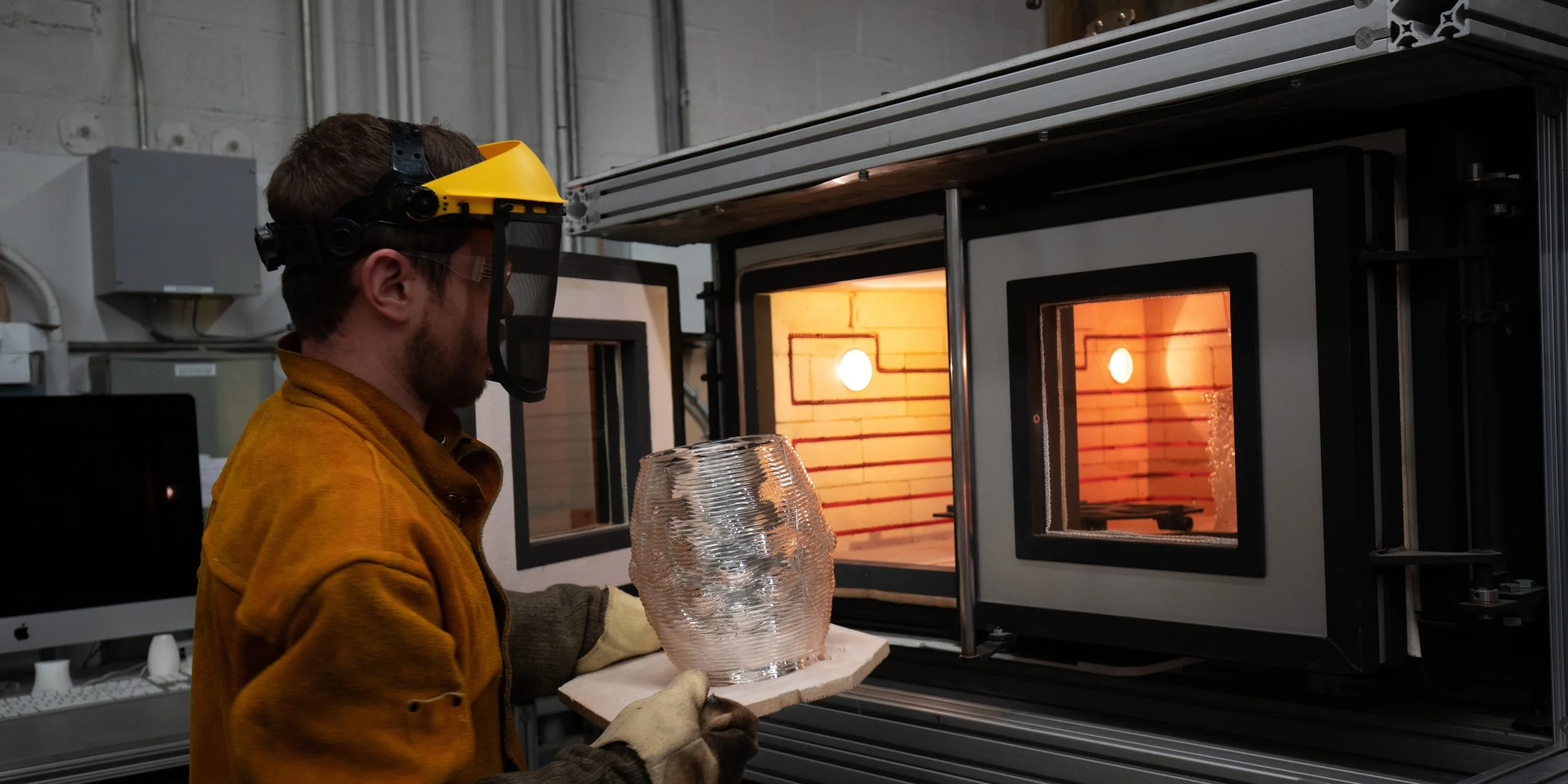 The process takes G-Code, the design instructions for precision machining defining thousands of points in 3D space, to control a custom computer controlled ceramic bed that traces out the form of each object. The machine architecture is considered completely from a blank canvas, designed to be accountable to the specific material properties and behaviors of molten silicate glass, and includes unique design and toolpathing suites characterized by machine motion rather than product geometry.